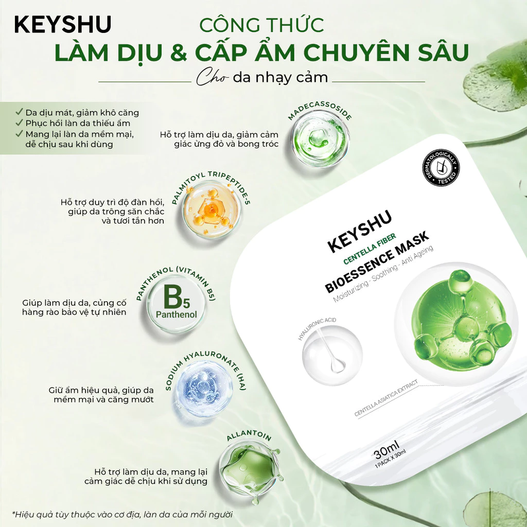 Các dòng mask của Keyshu như Bioessence Mask hoặc Bioessence Mask Premium chứa các thành phần làm dịu như chiết xuất rau má, Panthenol và Hyaluronic Acid, giúp bổ sung độ ẩm nhanh chóng và làm mềm lớp sừng. Khi da được cấp ẩm đầy đủ, bề mặt trở nên mịn hơn, hạn chế tình trạng bong tróc khi đánh nền.