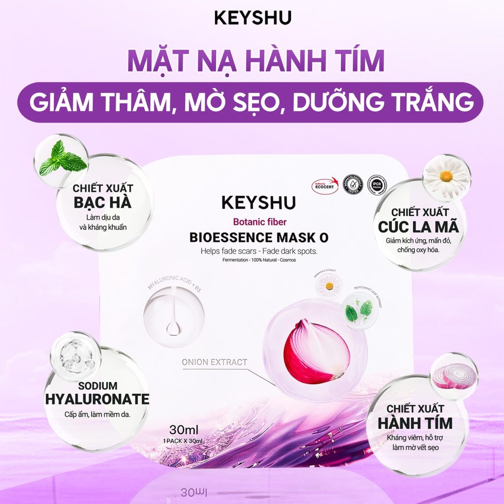 Trong hệ sinh thái mặt nạ làm từ sợi xơ thực vật của Keyshu, nếu dòng rau má được yêu thích nhờ khả năng làm dịu và phục hồi, thì Mặt nạ Hành Tím lại khẳng định vị thế riêng biệt trong việc xử lý các “tàn dư” sau mụn. Đây là kết quả của quá trình nghiên cứu sinh dược chuyên sâu, nhằm mang lại một diện mạo sáng mịn, đều màu và không tì vết cho làn da Việt.